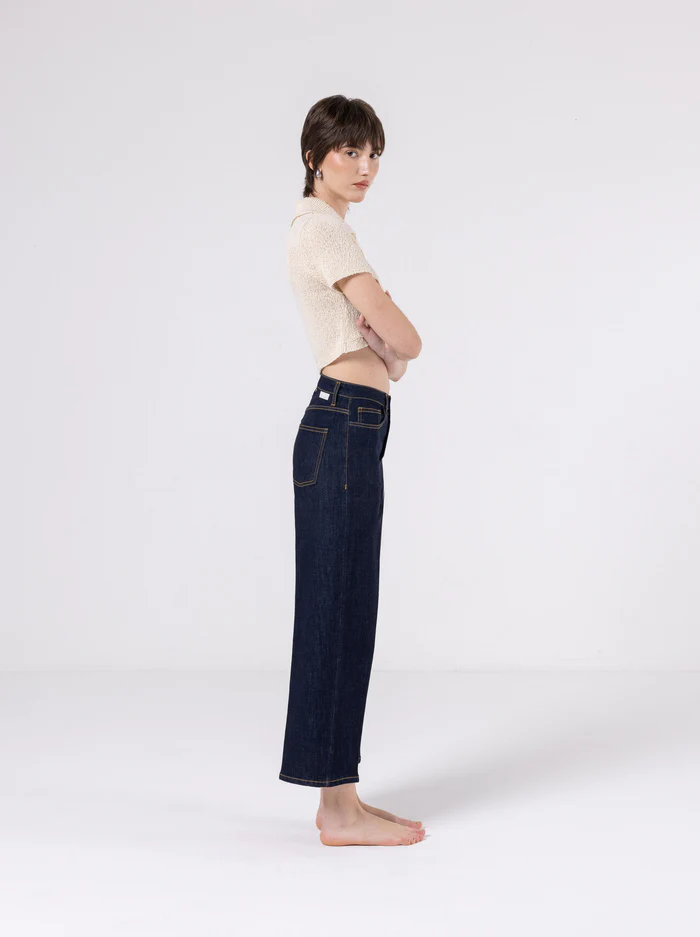 Il jeans Cancun unisce modernitร  ed eleganza quotidiana in una silhouette che slancia con naturalezza. Realizzato in cotone con l’aggiunta di elastan che rende il tessuto elasticizzato, morbido e confortevole accompagnando la figura con naturalezza e comfort quotidiano. La vita alta avvolge la figura con un tocco armonioso, mentre la gamba dritta con taglio corto alla caviglia dona leggerezza e un fascino contemporaneo, perfetto per accompagnare ogni passo con grazia. Le cinque tasche, funzionali e discrete, aggiungono un tocco autentico e pratico al design. Perfetto per creare outfit casual-chic per l’ufficio o per il tempo libero.