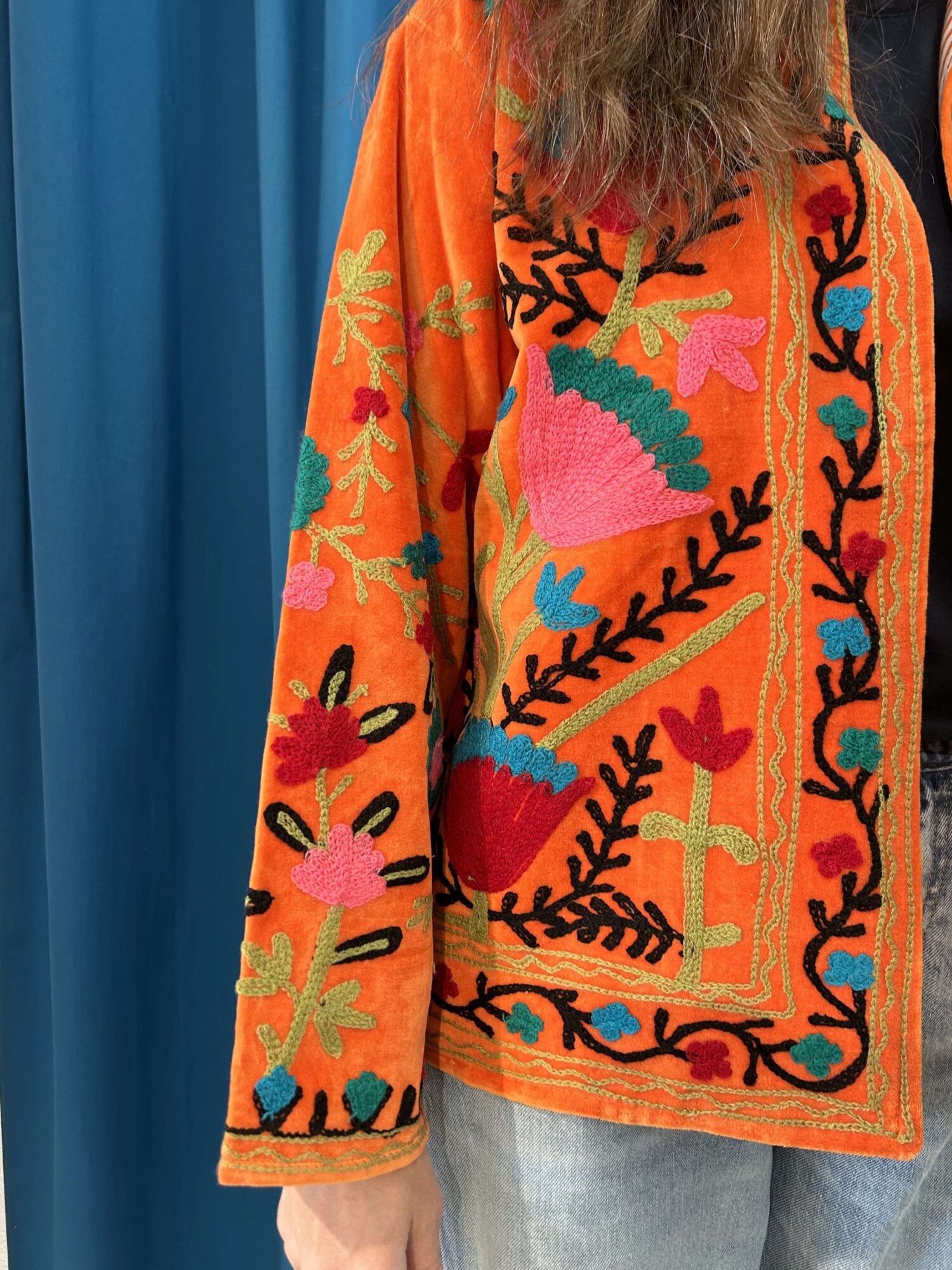 Giacca in velluto completamente ricamata con la tecnica del suzani realizzato a mano, rendendo ogni pezzo unico e irripetibile. La fodera interna in cotone con fantasia a righe la rende piacevole a contatto con la pelle. Questa giacca unisce la ricchezza dei dettagli alla raffinatezza di una linea morbida, studiata per donare struttura e armonia alla silhouette.