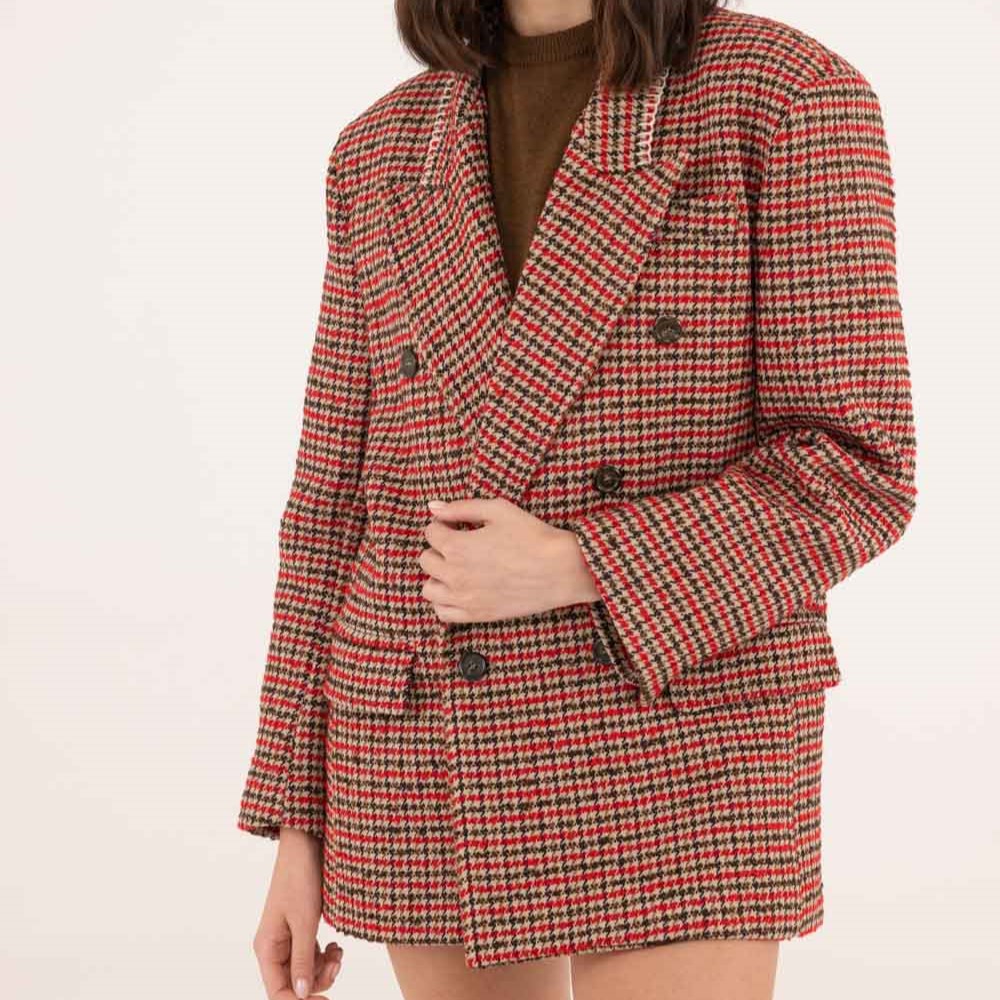 Blazer doppiopetto dallo stile elegante e raffinato, realizzato in cotone con un tessuto strutturato con l’iconico motivo pied de poule sui toni caldi del marrone, beige e rosso. Un capo moderno dal taglio sartoriale e lineare che valorizza la figura grazie ad elementi come spalline imbottite, tasche frontali con patta, bottoni, ampi rever e fodera interna. Perfetto da indossare come giacca o cappottino leggero durante la mezza stagione. Completa l’outfit con lo shorts coordinato, un dolcevita, una calza velata e dei mocassini per un’eleganza disinvolta, ma chic oppure abbinalo ad un pantalone sartoriale per un look da ufficio impeccabile.