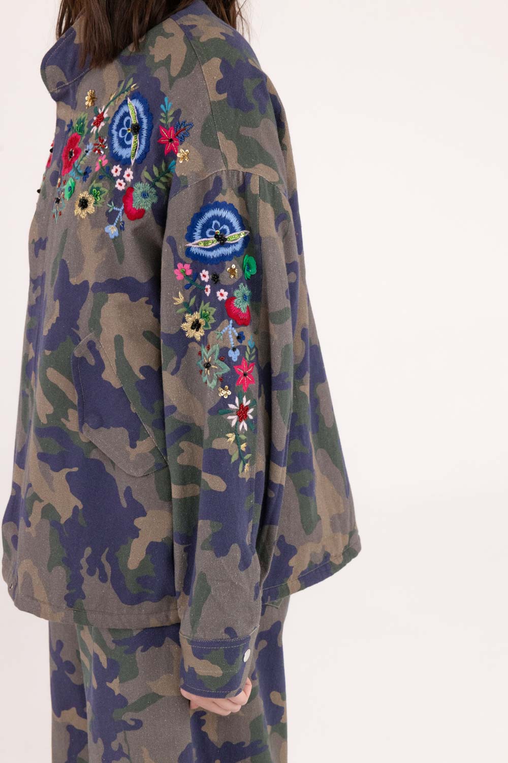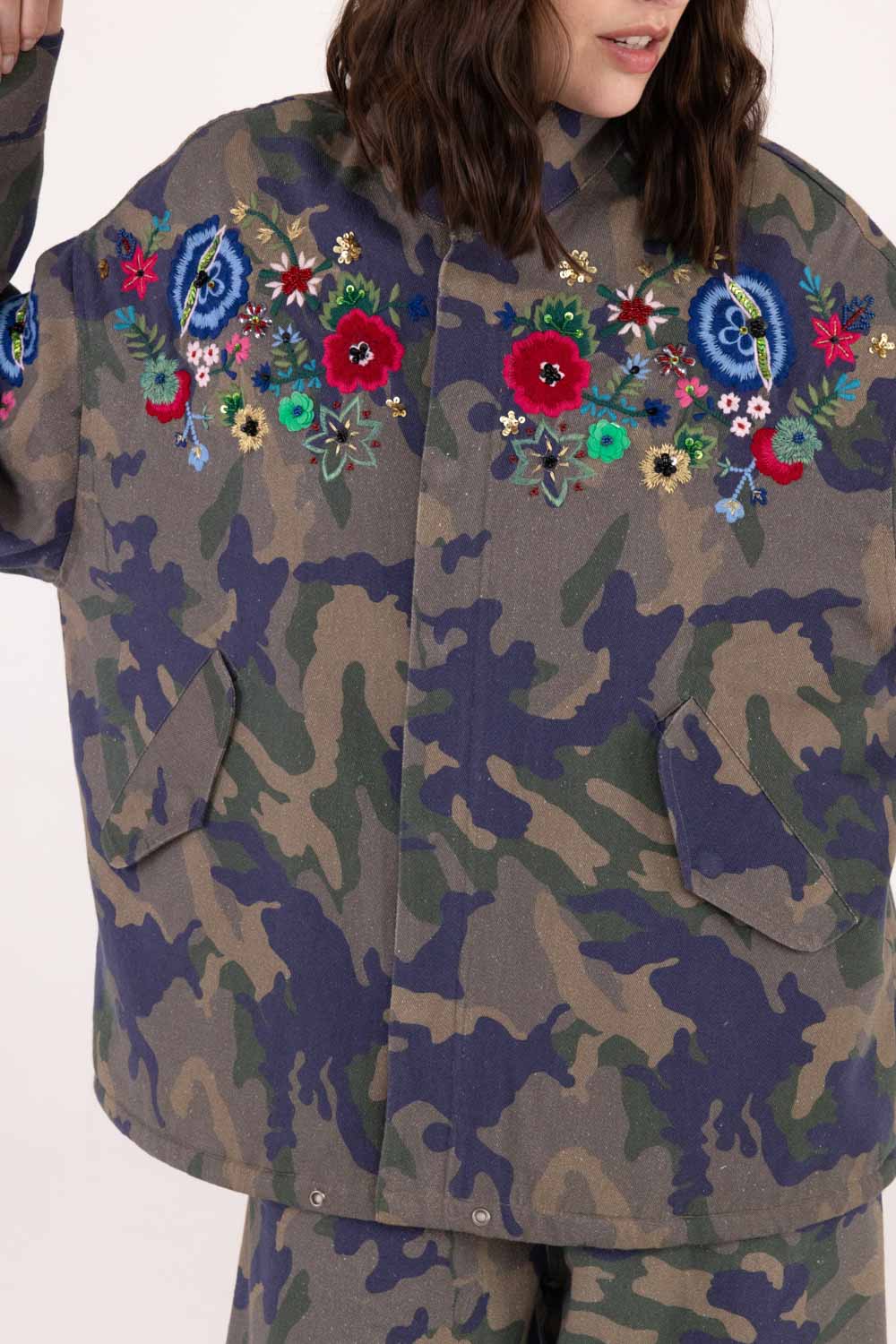 La rivisitazione piรน cool dell’iconica military jacket. Giacca con stampa camouflage sui toni del verde, marrone e blu con collo alla coreana, tasche frontali con patta e taglio bomber oversize che rappresenta la reinterpretazione in chiave moderna della classica military jacket. Realizzata in gabardina di cotone con rivestimento interno in morbido teddy, รจ adatta anche alla stagione piรน fredda assicurando calore e comfort. I preziosi ricami floreali super colorati e l’applicazione di perline sono dei dettagli unici che la rendono originale, aggiungendo un tocco femminile. Perfetta da indossare con outfit quotidiani composti da denim, maglioni oversize o felpe e sneakers per avere un tocco casual-chic di spicco.