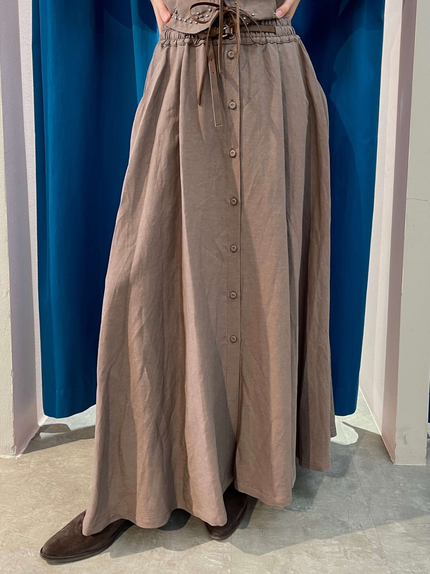Gonna lunga dal taglio ampio e fluido realizzata in misto lino che dona leggerezza e movimento ad ogni passo. La vita elasticizzata con cinturina in cuoio incorporata, i bottoncini frontali e le maxi tasche sul retro offrono comfort e funzionalitร , mentre le borchie laterali le conferiscono un tocco prezioso. Abbinala al suo gilet coordinato e aggiungi cappello e stivali texani per un look in perfetto stile country-chic.