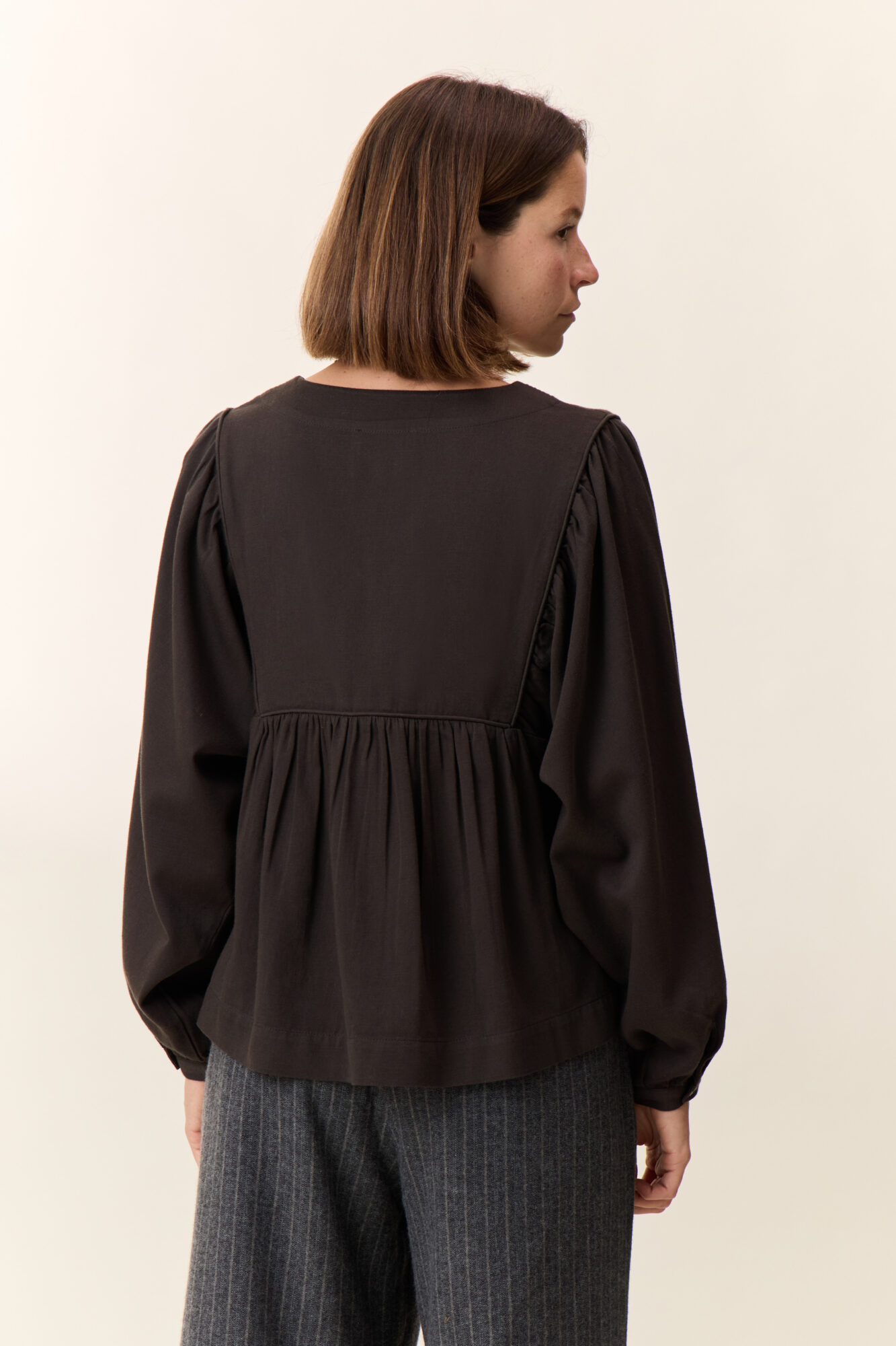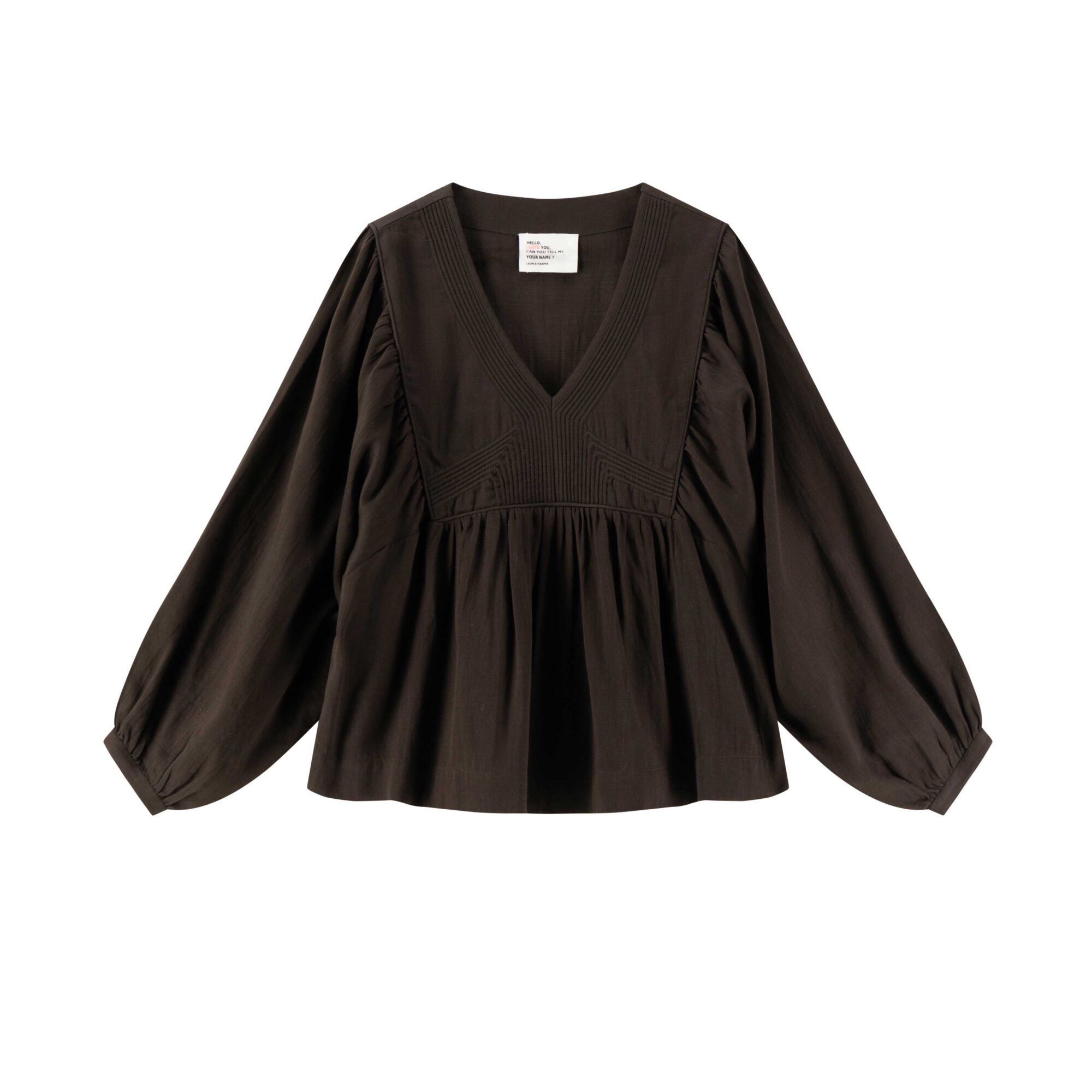 La camicia che ti conquisterร  per il suo fascino retrรฒ-chic. Realizzata in cotone in una profonda tonalitร  marrone cioccolato, dal taglio fluido arricchito da una scollatura a V che incornicia il dรฉcolletรฉ con eleganza รจ perfetta per esaltare la silhouette femminile. Il carrรฉ plissettato e le pieghe verticali sulla scollatura creano una texture raffinata e romantica, mentre le maniche ampie le donano il giusto volume. Ideale per essere abbinata a jeans a palazzo o a pantaloni sartoriali per look quotidiani versatili e senza tempo.