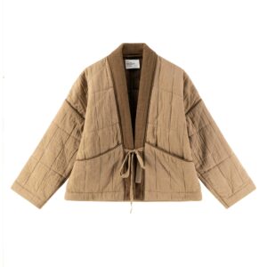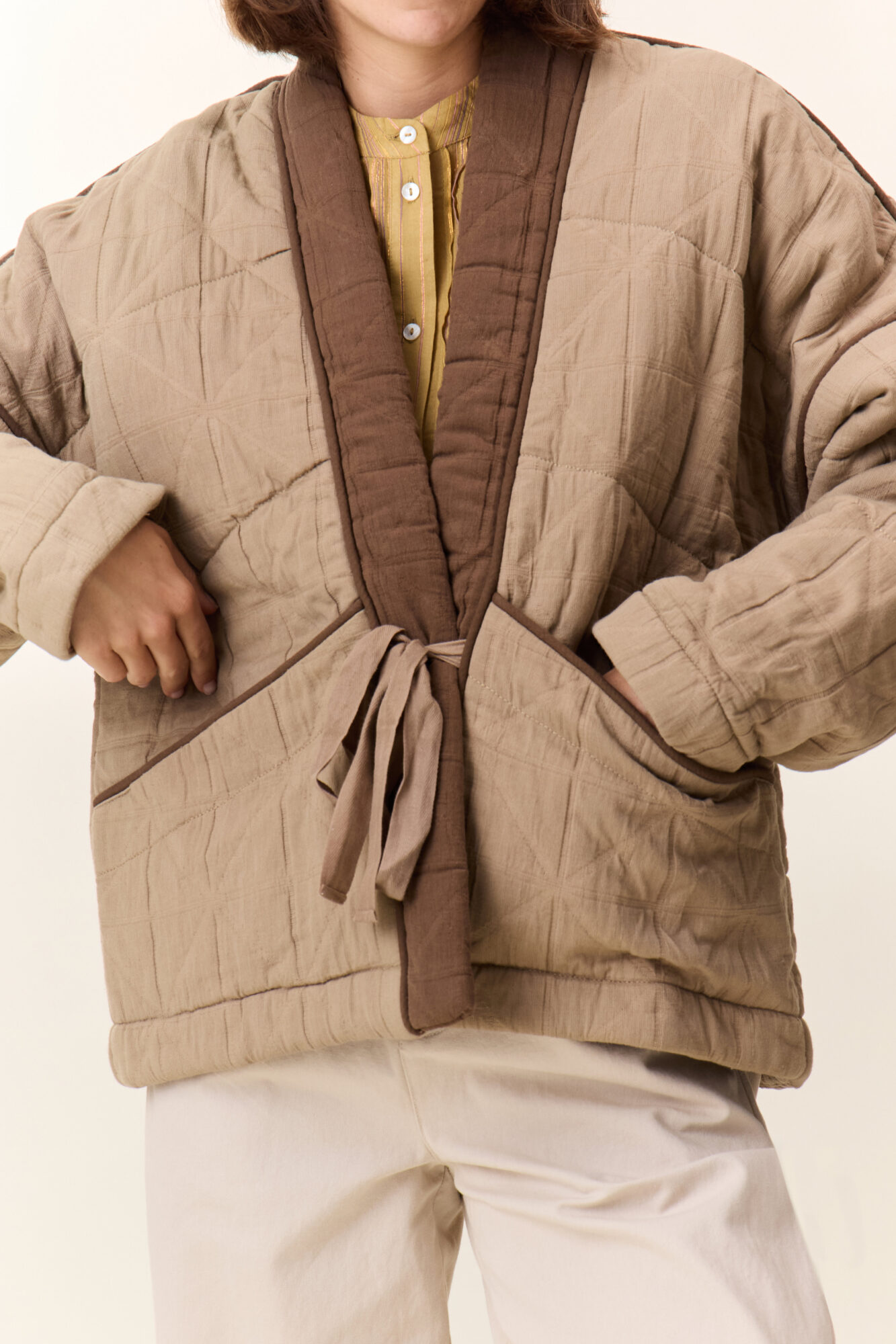 Questa giacca รจ la rivisitazione del classico taglio kimono con un tocco urban-chic. Realizzata in cotone trapuntato in rilievo color beige con collo a scialle e bordatura a contrasto color marrone. La combinazione di maniche ampie e spalle scese senza cuciture dona struttura e volume alla figura, mentre la chiusura con il laccio da annodare permette di regolare la vestibilitร  a piacere. Indossala sopra un abito oppure con jeans e pantaloni ampi o a zampa per un look casual-chic dal sapore urban.