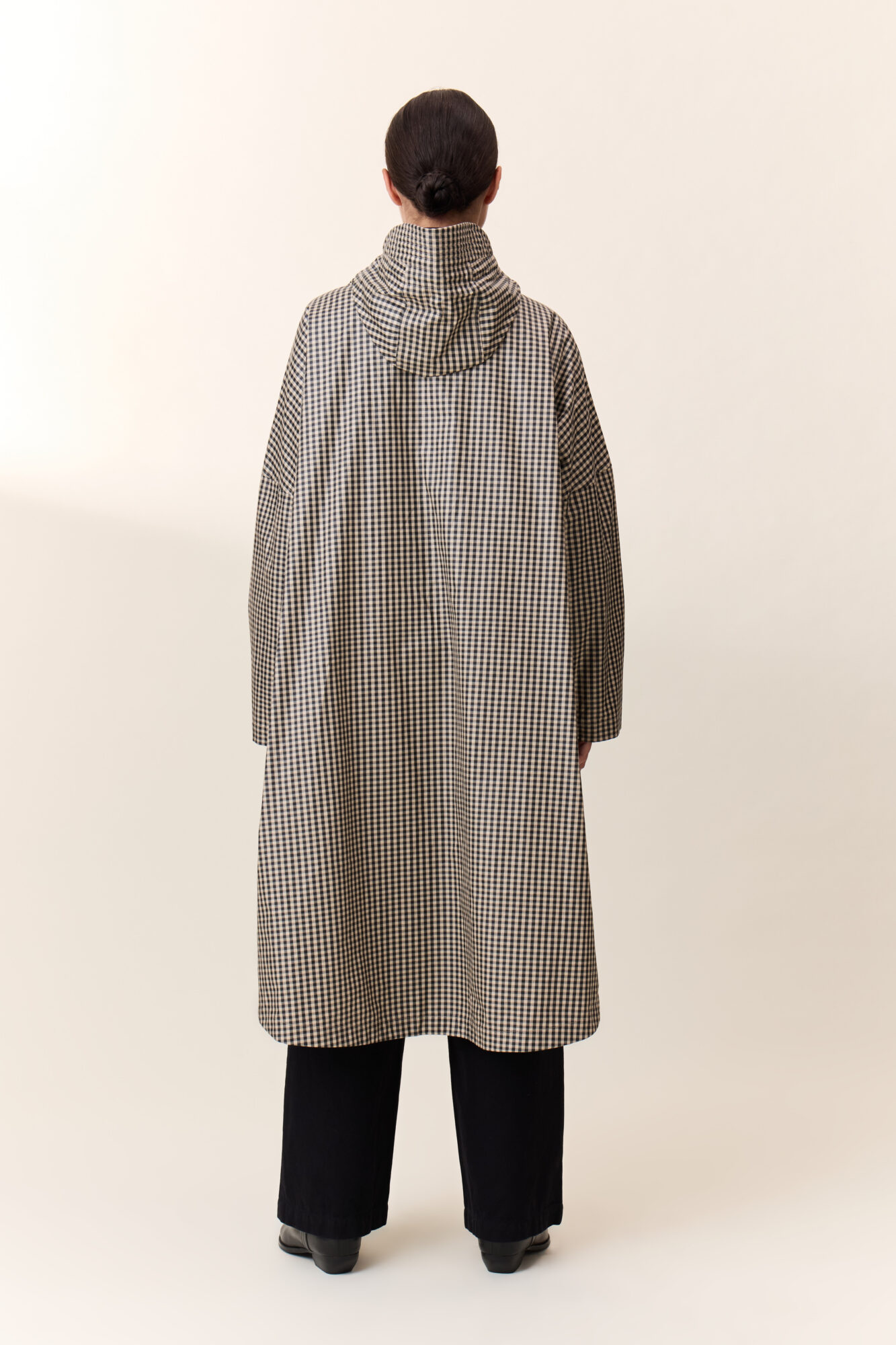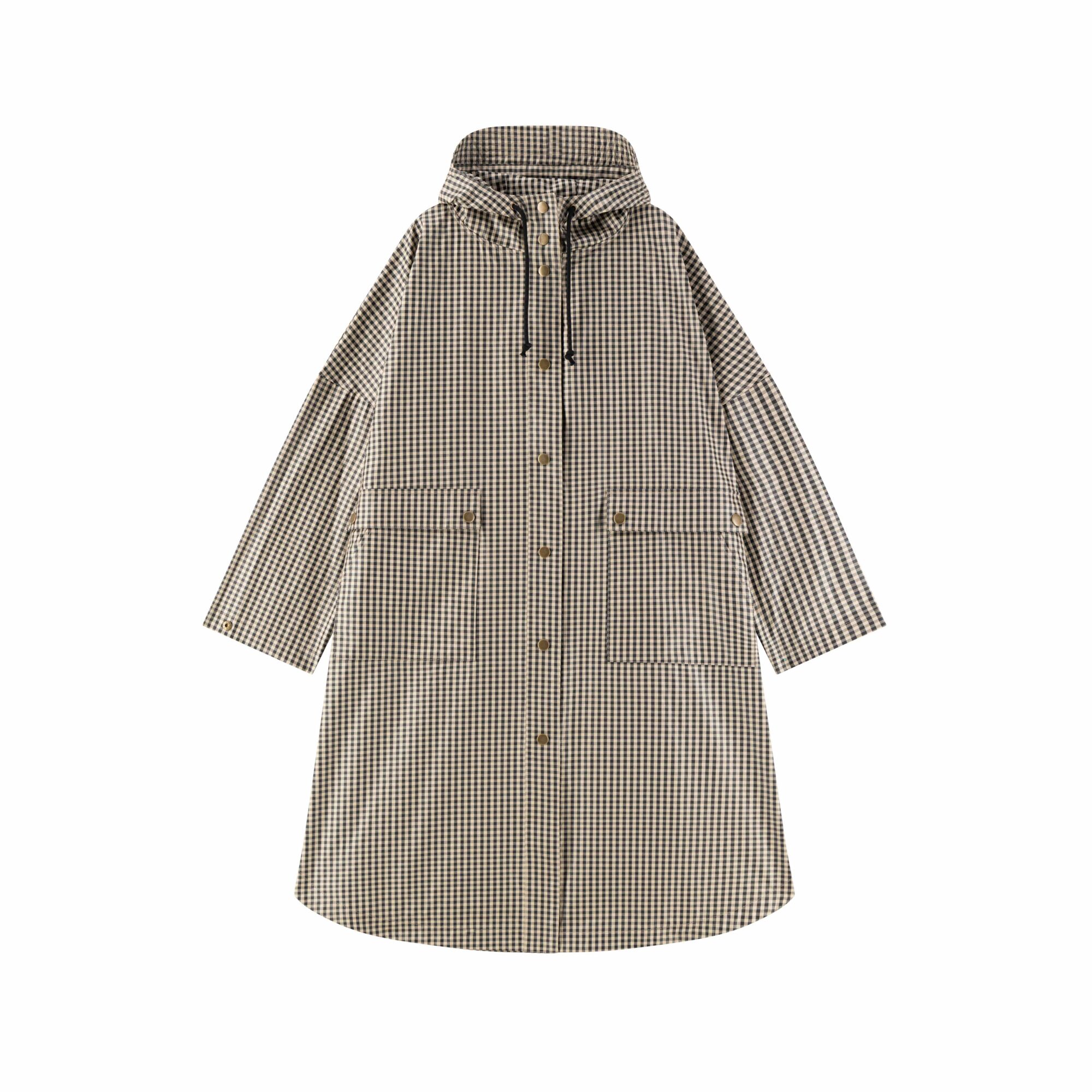 Questo poncho rappresenta l’unione perfetta tra funzionalità e originalità. Realizzato in cotone rivestito, è ideale per le giornate di pioggia grazie alla presenza del cappuccio regolabile con coulisse e alla lunghezza fino a metà polpaccio che protegge e ripara le gambe. La linea ampia e oversize avvolge il corpo con eleganza garantendo massima libertà nel movimento, mentre il motivo a quadri ispirato ai classici tessuti british lo rende sofisticato, ma del tutto informale.