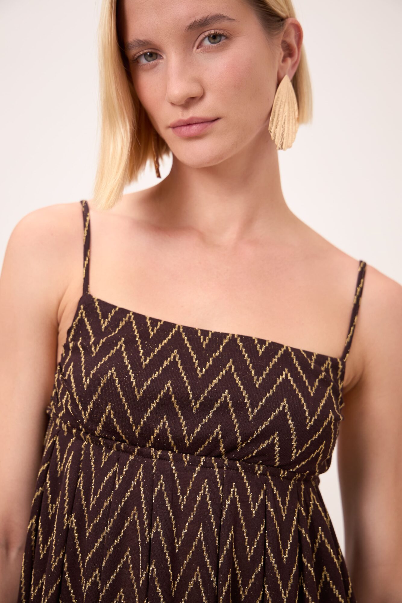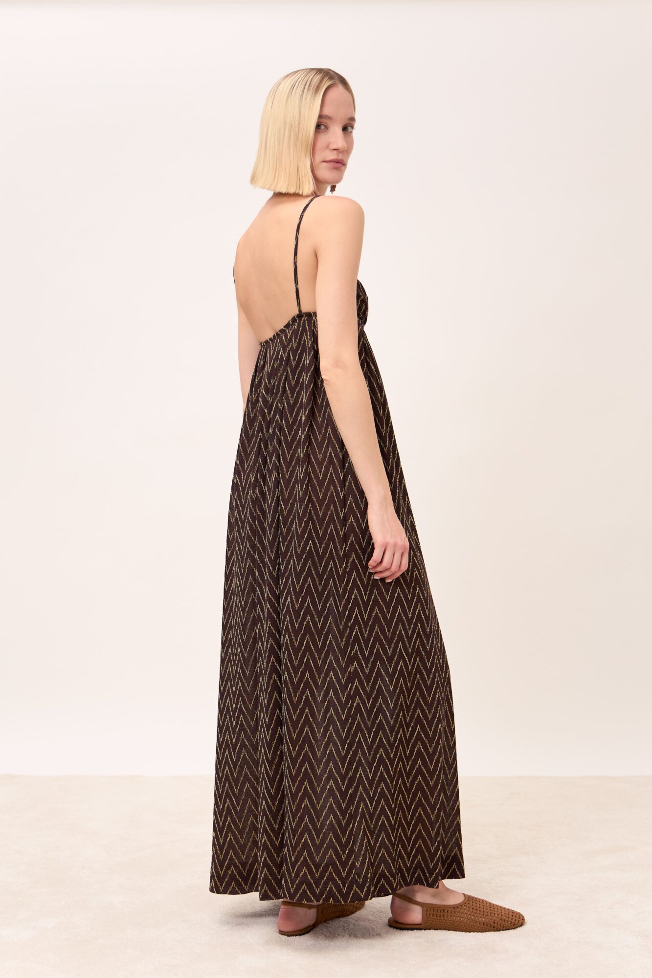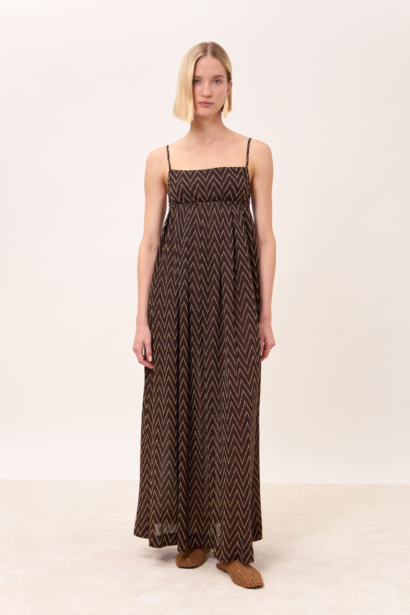 Un abito lungo casual-chic perfetto per accompagnarti nelle tue giornate estive oppure in una serata speciale. Realizzato in prezioso jacquard leggero su base viscosa in un motivo zig zag oro in lurex su base marrone testa di moro. Lo scollo dritto e le spalline sottili valorizzano le spalle in modo pulito e delicato, mentre il taglio sotto seno e la linea morbida e ampia della gonna donano fluidità e leggerezza ad ogni movimento rendendolo comodo, ma sofisticato. Indossalo con una t-shirt basic e sandali per un look più casual oppure con il kimono Marylin coordinato e una décolleté per un look più chic ed elegante.