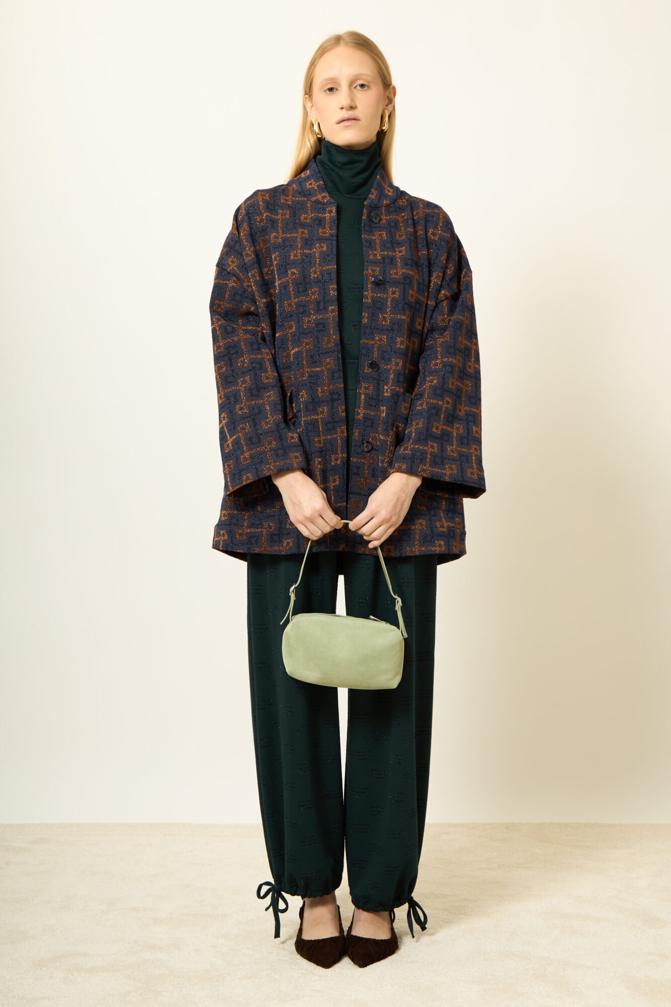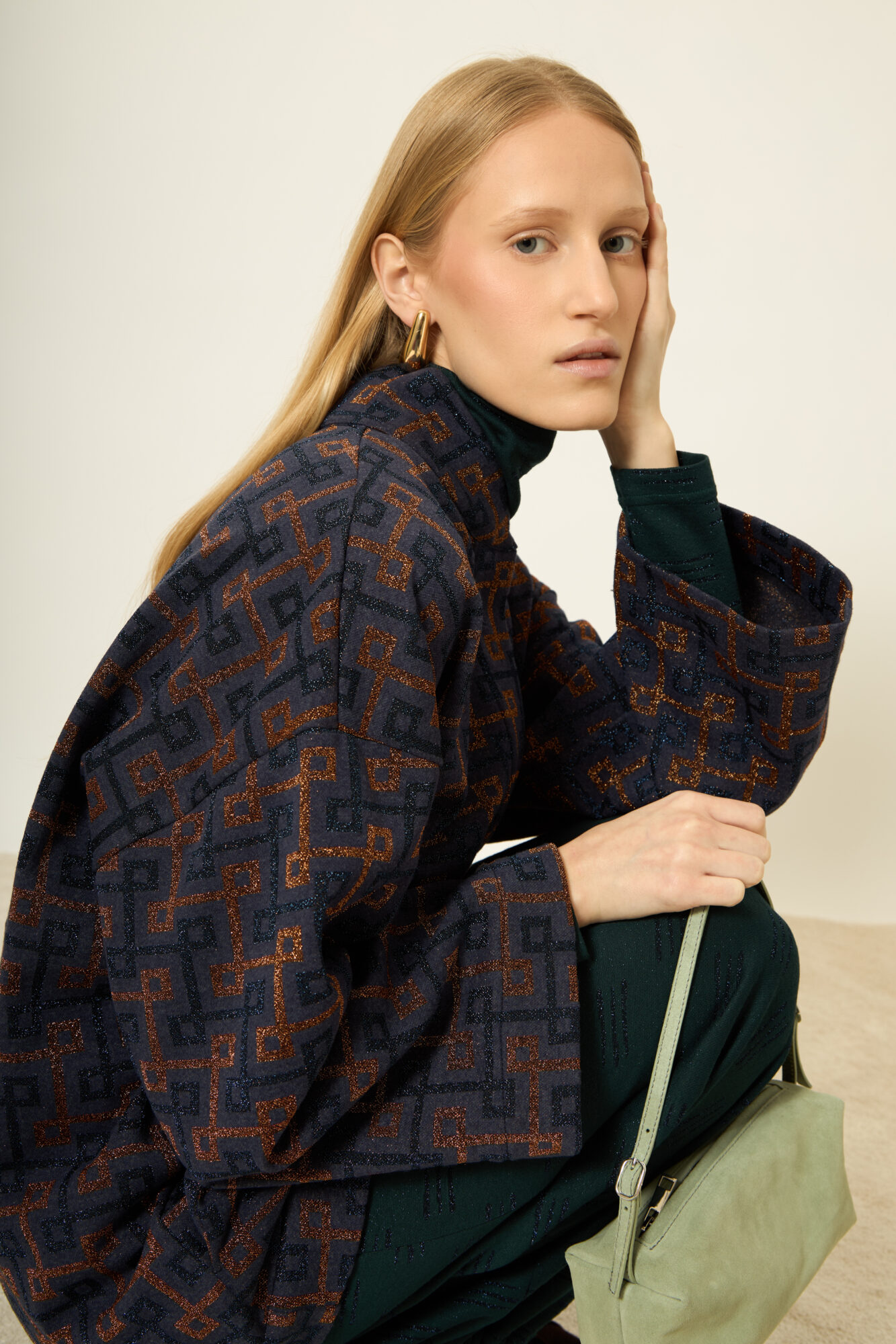 La giacca Cicale incarna un’eleganza senza tempo che avvolge la figura come un abbraccio. Realizzata in pregiato jacquard su base cotone colore blu, รจ impreziosita da una delicata fantasia geometrica in lurex bronzo e blu che riflette la luce con discrezione e grazia. Il taglio oversize, le maniche ampie e il girocollo la rendono un capo comodo ma raffinato, perfetto da indossare aperto o abbottonato grazie ai bottoni frontali coperti. Le maxi tasche aggiungono funzionalitร  senza rinunciare allo stile. Da abbinare al pantalone Polinesia coordinato per un look da cerimonia sofisticato o per unโ€™occasione speciale che merita un tocco unico.
