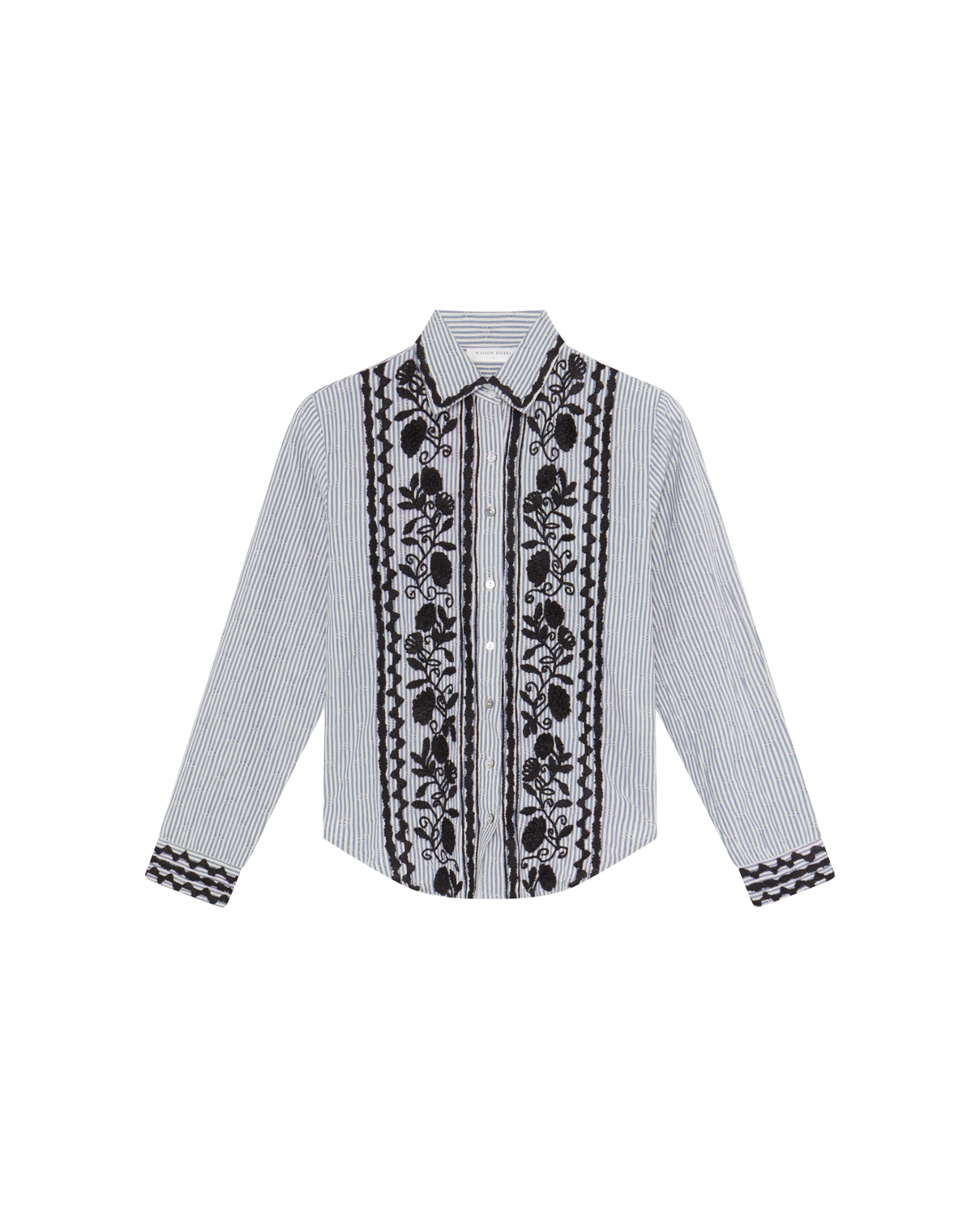Camicia a righe bianche e azzurre dal taglio classico e intramontabile, reinterpretata in chiave romantica grazie alla presenza di uno splendido ricamo frontale dal colore blu che corre lungo la parte frontale e decora elegantemente i polsini. Il modello presenta un colletto tradizionale, bottoncini frontali e una vestibilitร  regolare. Il mix tra la sobrietร  delle righe e la ricercatezza del ricamo crea un equilibrio perfetto tra stile quotidiano e dettagli dโ€™autore.
