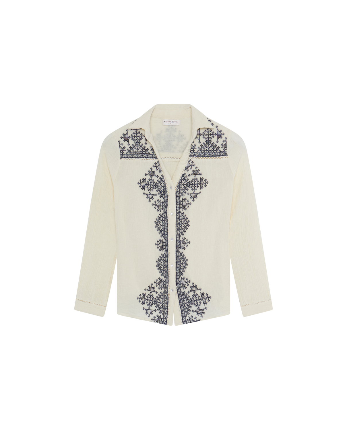 Camicia bianca dal fascino artigianale, realizzata in morbido crepe di cotone con effetto stropicciato naturale che le dona carattere e leggerezza. Il design รจ valorizzato da un elegante colletto classico e da una fila di bottoncini frontali, accompagnati da uno splendido ricamo blu in stile etnico che decora la parte centrale e le spalle, creando un raffinato contrasto cromatico. Fresca e versatile, questa blusa รจ lโ€™alleata perfetta per look casual ma curati, ideale da abbinare a un denim per un tocco boho-chic.
