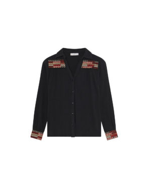 Dal carattere deciso ma dallโ€™anima raffinata, questa camicia nera in garza di cotone unisce semplicitร  e dettagli preziosi. I ricami etnici sulle spalle e sui polsini, nei toni caldi del rosso, beige e nero con accenti dorati, le aggiungono un tocco artigianale e luminoso. Il colletto classico, i bottoncini e il taglio regolare la rendono un capo versatile, perfetto per completare con stile anche i look piรน minimal.