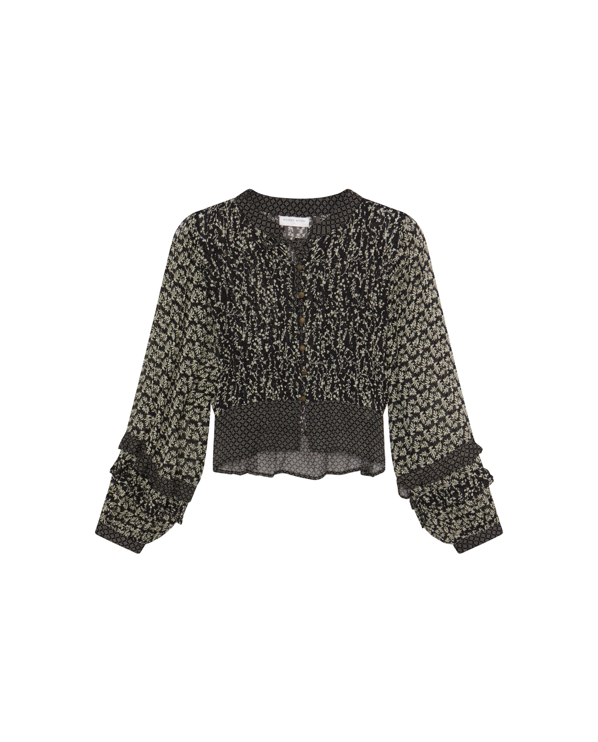 Camicia girocollo realizzata in georgette viscosa perfetta per chi ama uno stile raffinato e romantico. Il taglio cropped valorizza la figura con grazia, mentre la stampa microfloreale beige su fondo nero dona un fascino bohรฉmien e femminile. I piccoli bottoni metallici e i volant sulle maniche aggiungono un tocco poetico, rendendo il capo perfetto per chi ama lโeleganza morbida e ricercata. Inclusa una canotta interna nera per garantire comfort e coprenza. Questa blusa รจ ideale da indossare con jeans a vita alta, pantaloni a palazzo e gonne midi per look casual-chic sofisticati.