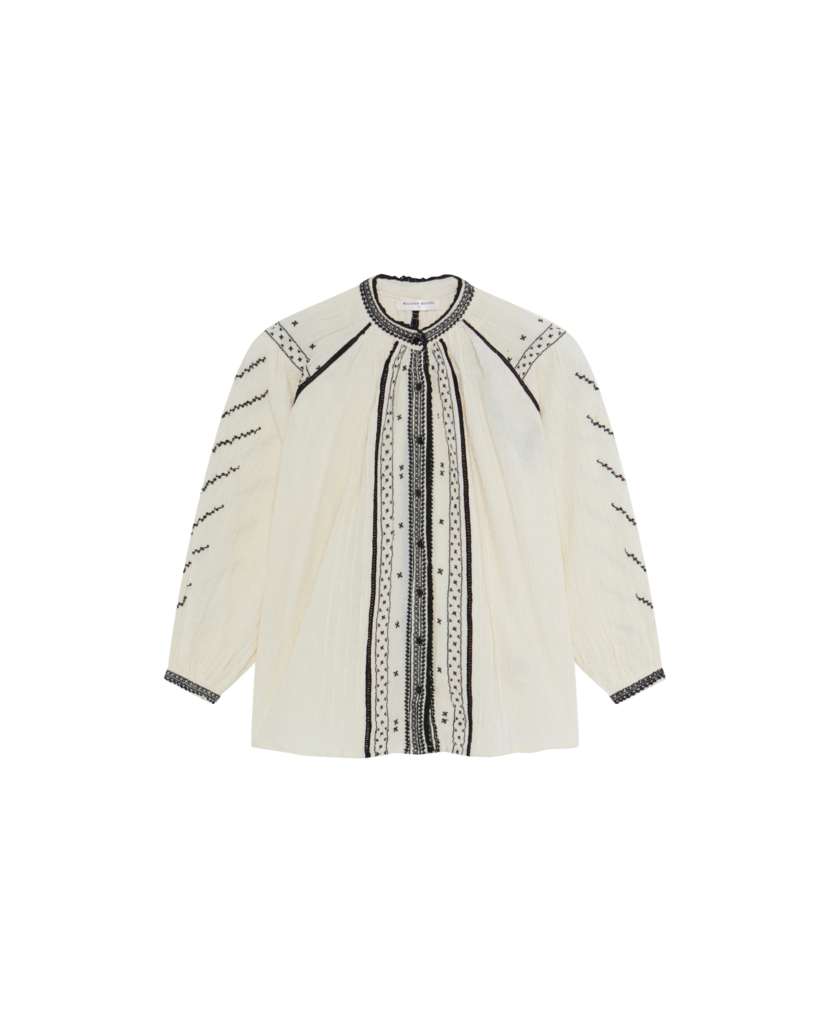Camicia girocollo color avorio realizzata in pregiato crepe di cotone, impreziosita da delicati ricami a contrasto nei toni del nero. Manica raglan e ampia, bottoncini frontali e vestibilitร  morbida sulla figura che le donano un’eleganza poetica e romantica. Un capo sublime dal fascino bohรฉmien, pensato per aggiungere un tocco sofisticato ai tuoi outfit quotidiani. Abbinala a jeans flare e sneakers per un look piรน casual oppure a pantaloni dal taglio palazzo gessati o spinati per un look piรน ricercato adatto anche per l’ufficio.