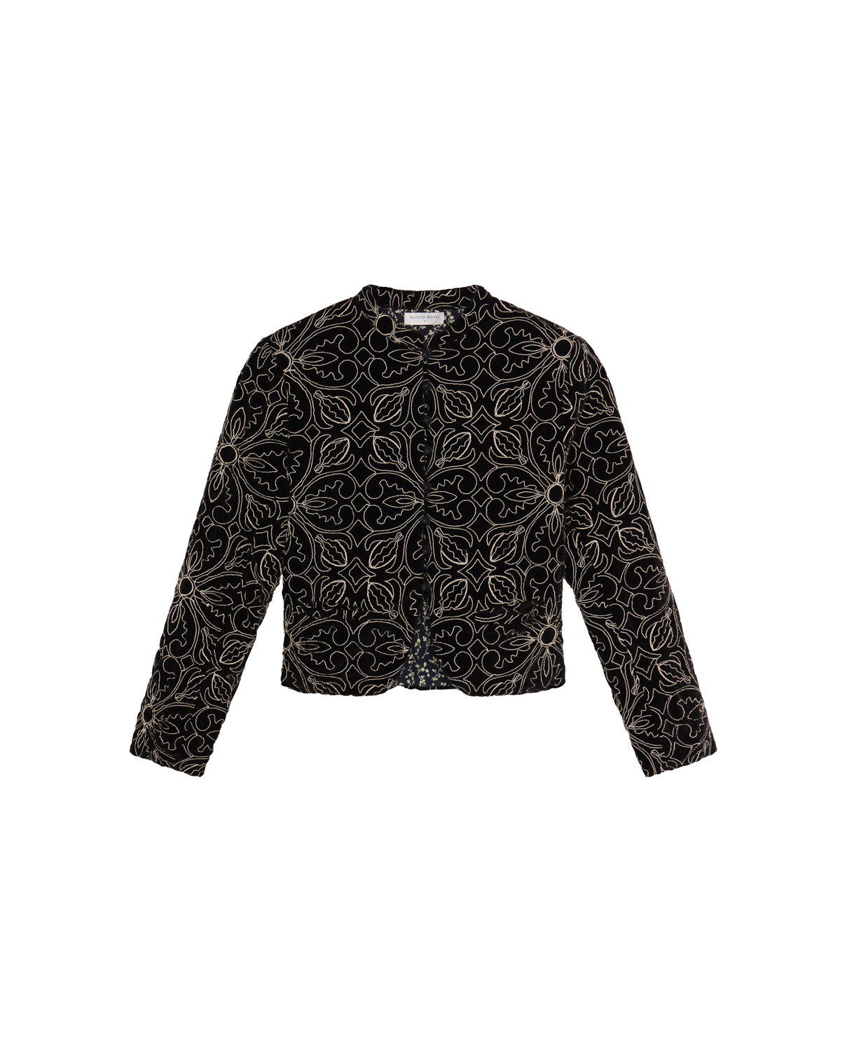 Giacchino cropped dal design sofisticato, realizzato in morbido velluto nero con motivo floreale stilizzato ricamato in bianco e ispirato all’atmosfera retrรฒ dell’epoca bohรฉmien. Presenta una chiusura con piccoli bottoncini in metallo e spalline imbottite che definiscono la struttura del capo. La fodera interna in fantasia microfloreale aggiunge un tocco nascosto, ma prezioso. Un capo che dona carattere e personalitร  al tuo outfit, perfetto da abbinare a look casual piรน basici o a look serali piรน eleganti.