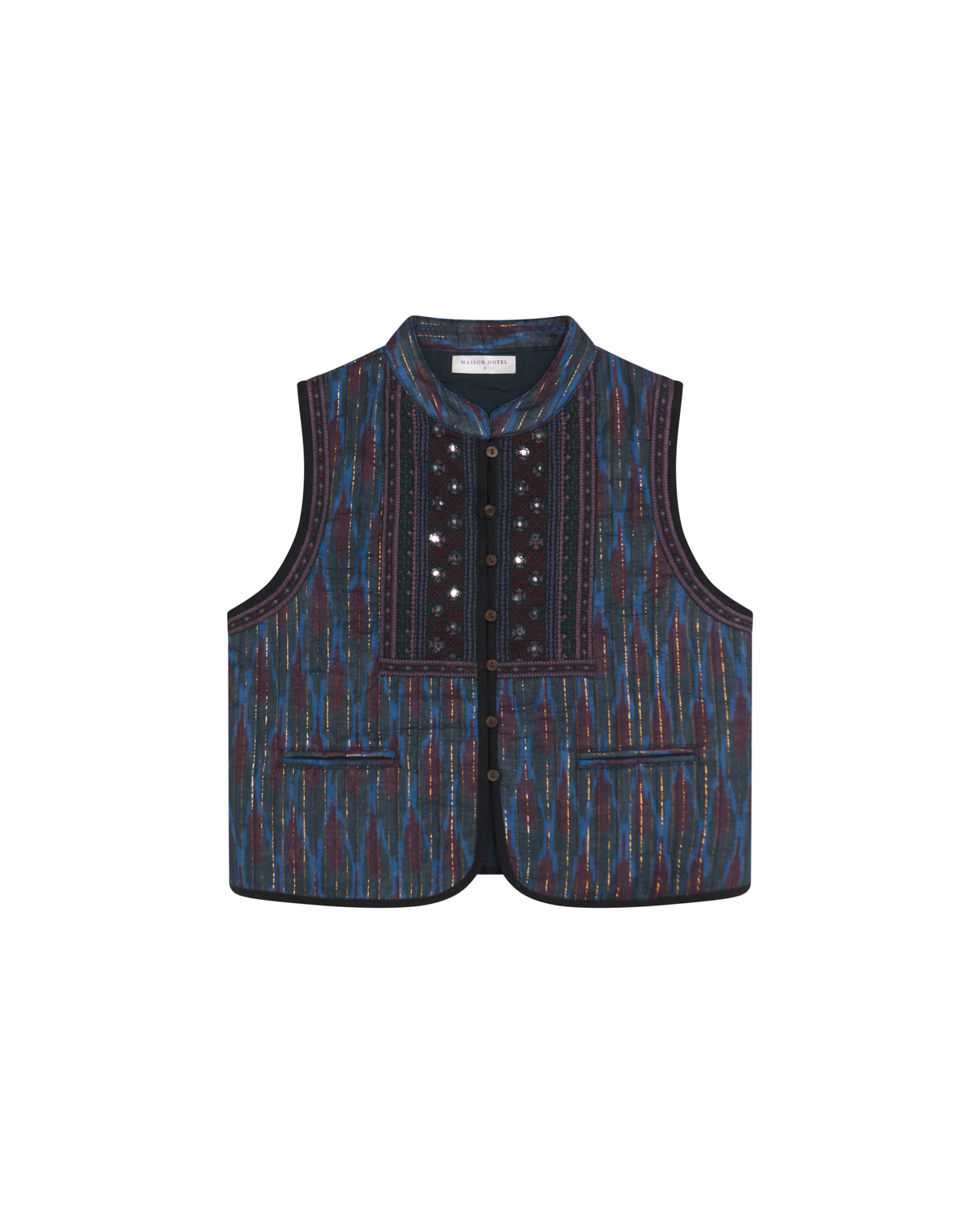 Gilet trapuntato realizzato in cotone impreziosito da un elegante filo lurex che si fonde armoniosamente con una vivace fantasia etnica nei toni freddi del blu, viola e turchese che ricordano i colori profondi dell’oceano. Presenta dei bottoncini frontali in legno, mentre il giro manica e la parte centrale sono abbellite da delicati ricami sui toni del viola con l’aggiunta di piccoli specchietti che donano luce al capo. Il taglio dritto e regolare arricchito da splendidi dettagli gli dona un carattere artigianale e sofisticato. Indossalo sopra ad un dolcevita o ad una camicia leggera con un denim o pantalone a vita alta a palazzo per un look ricercato dal sapore bohรฉmien.