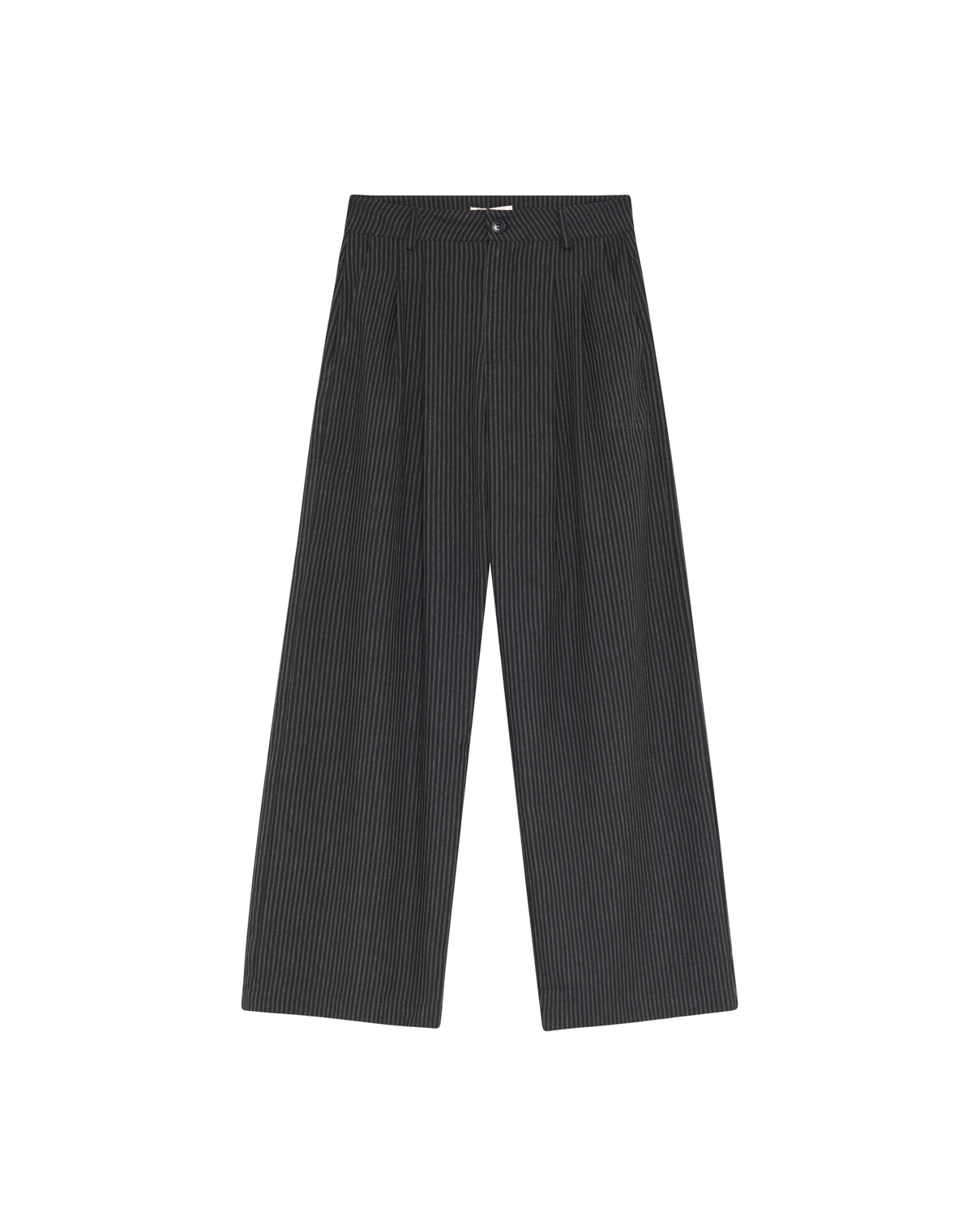 Un classico del guardaroba maschile reinterpretato in chiave femminile: questo pantalone con motivo gessato sui toni del grigio e nero รจ il capo perfetto per aggiungere carattere ai tuoi look da ufficio o da cittร . Realizzato in un morbido mix di viscosa e poliestere, ha una linea a palazzo fluida e una vita molto alta che donano struttura ed eleganza alla figura.