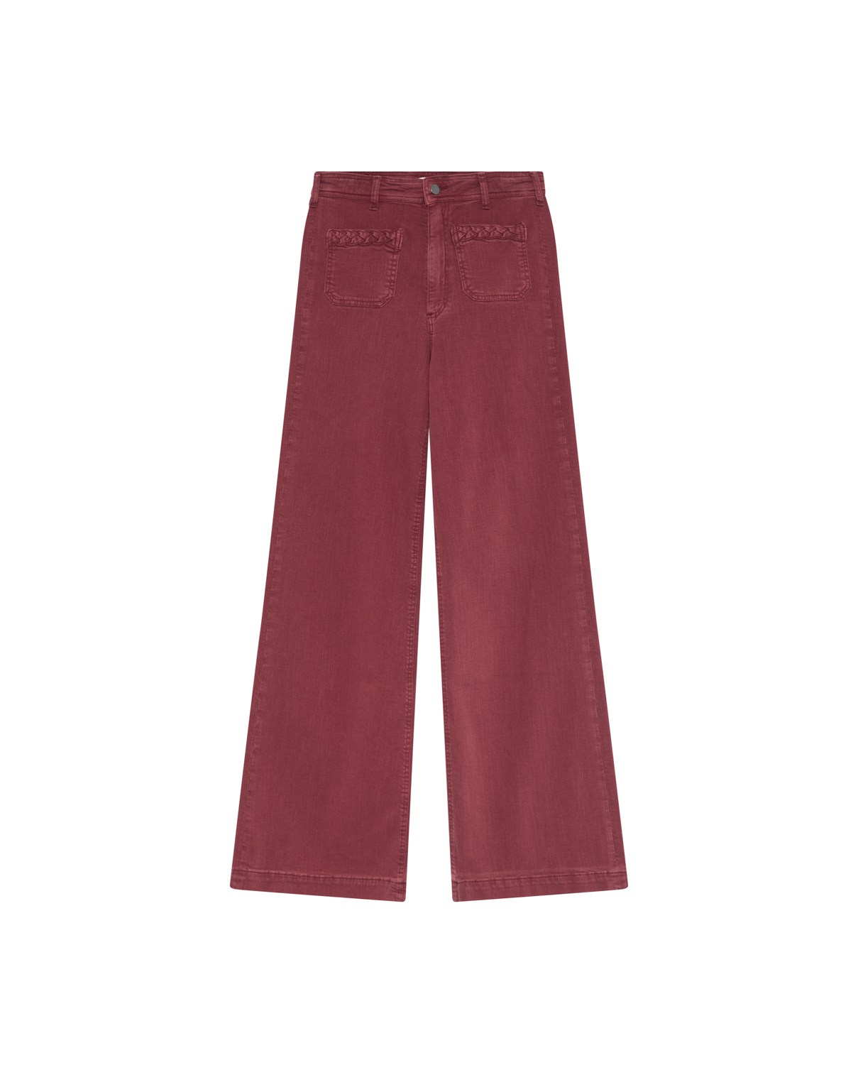 Pantalone realizzato in cotone misto lyocell color bordeaux, tonalitร  perfetta da indossare in questa stagione autunno/inverno. Si distingue per il taglio flare e vita alta, punti essenziali per valorizzare la silhouette femminile. Le taschine anteriori impreziosite da un elegante dettaglio intrecciato lo rendono un capo raffinato. Ideale per dare un tocco chic ai tuoi outfit quotidiani.