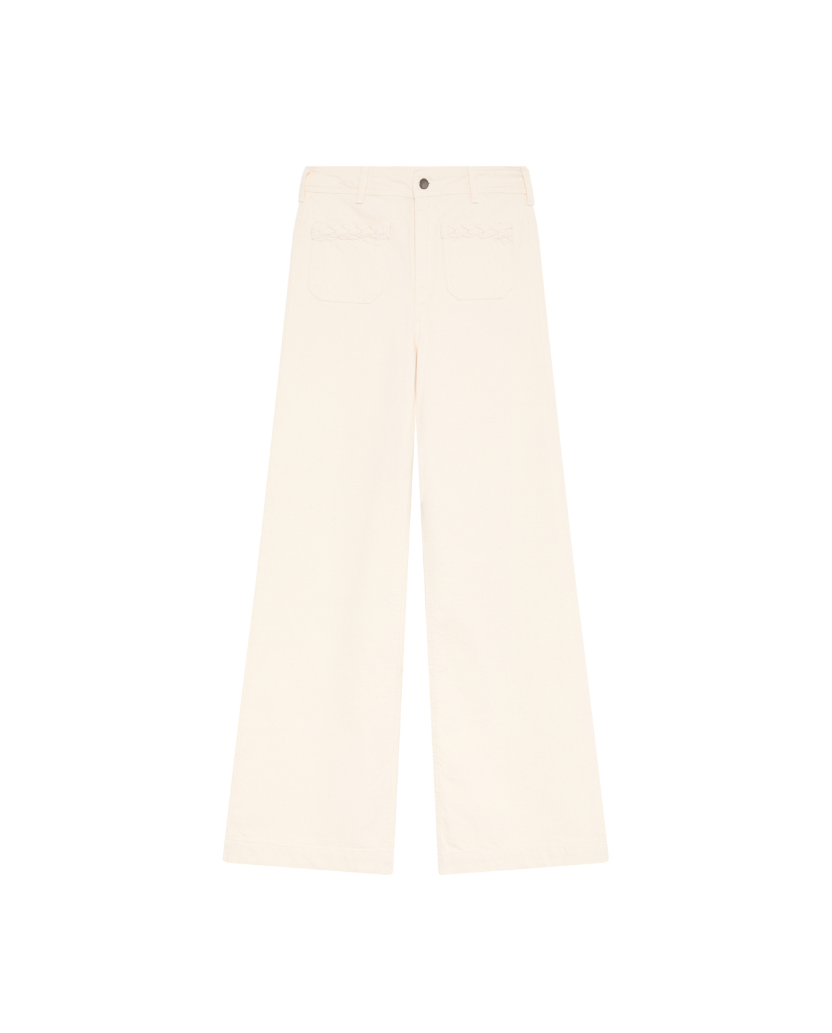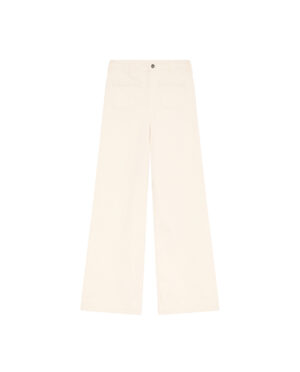 Pantalone realizzato in una miscela sostenibile di cotone e poliestere, unisce la naturalezza dei materiali con la praticità di un fit ampio e fluido. Il colore ecrù lo rende un capo neutro e versatile da indossare in ogni stagione, mentre il taglio a palazzo e la vita alta lo rendono perfetto per valorizzare la silhouette femminile.
