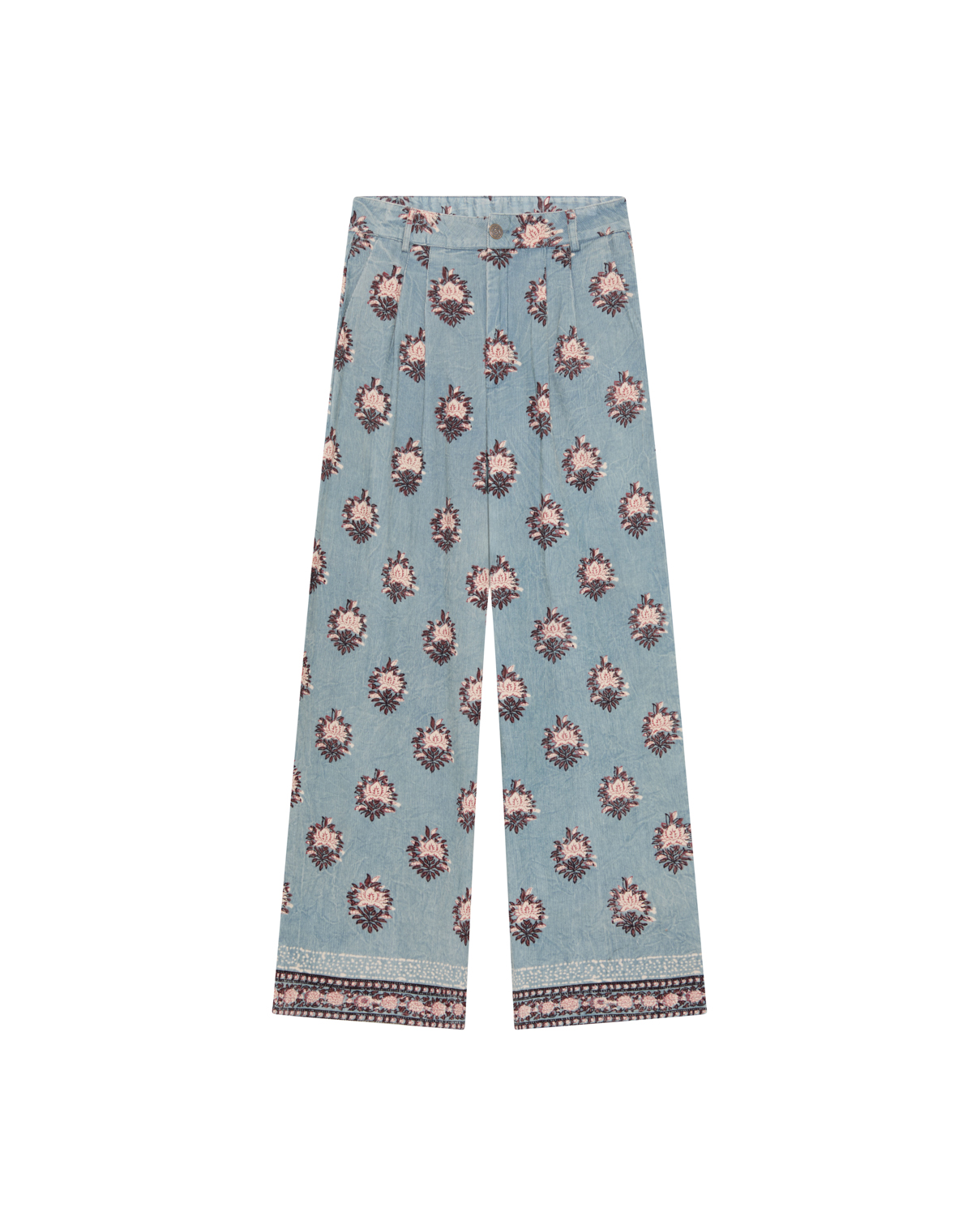 Comodo come un pantalone casual, elegante come un pezzo d’autore. Questo pantalone in microvelluto a costine color ceruleo รจ un inno allo stile boho-chic con un tocco retrรฒ. La stampa floreale all-over, ispirata ai motivi etnici, lo rende un capo unico da indossare con facilitร  ogni giorno se abbinato a indumenti piรน basici come dolcevita, maglioni o camicie.