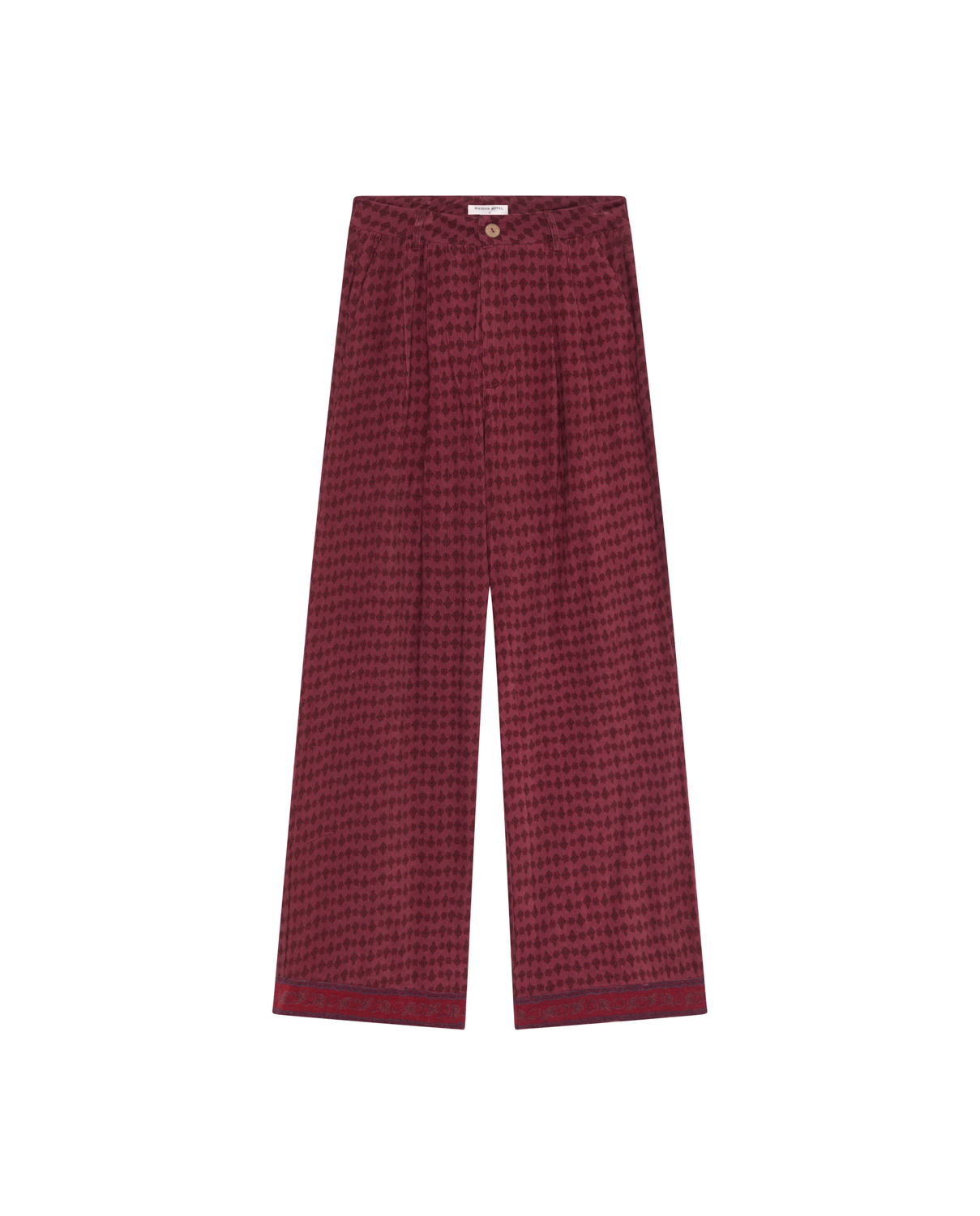 Comodo come un pantalone casual, elegante come un pezzo d’autore. Questo pantalone in microvelluto a costine color bordeaux รจ un inno allo stile boho-chic con un tocco retrรฒ. La stampa caratterizzata da piccoli rombi tono su tono con un effetto chiaro-scuro lo rende un capo unico da indossare con facilitร  ogni giorno se abbinato a indumenti piรน basici come dolcevita, maglioni o camicie.
