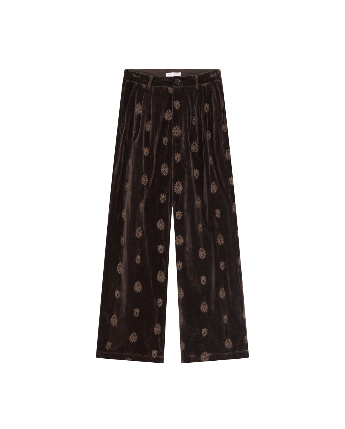 Comodo come un pantalone casual, elegante come un pezzo d’autore. Questo pantalone in velluto color marrone cioccolato รจ un inno allo stile boho-chic con un tocco retrรฒ. La superficie รจ impreziosita da delicati ricami tono su tono che lo rendono un capo unico da indossare con facilitร  ogni giorno se abbinato a indumenti piรน basici come dolcevita, maglioni o camicie. Abbinalo al gilet Kafka coordinato, dolcevita o camicia, blazer Jackie, stivali texani e cappello per un look ricercato dal sapore boho-chic.