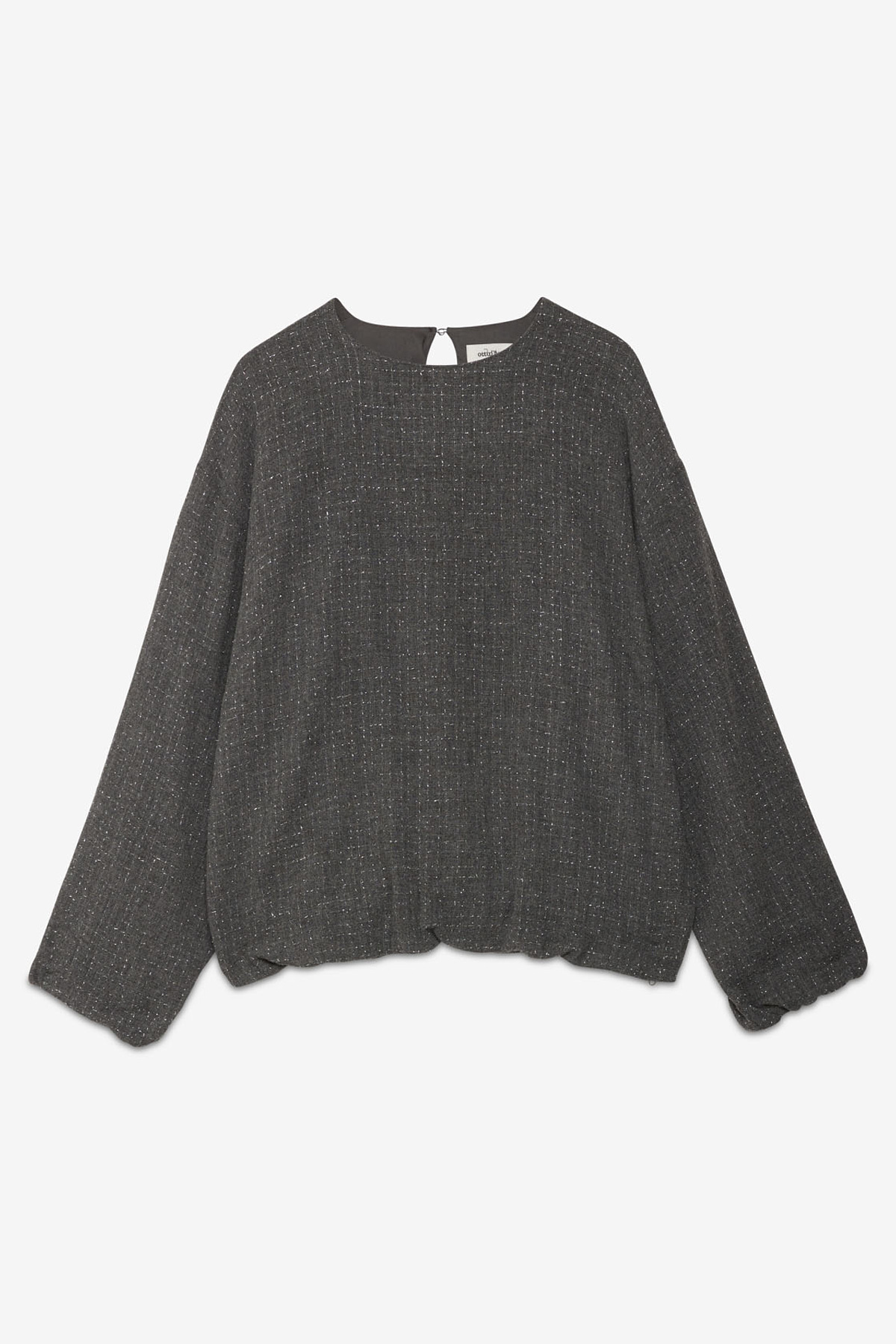 Lasciati avvolgere dalla delicatezza di questa blusa a palloncino, un capo che fonde comfort e raffinatezza in unโ€™unica silhouette elegante. Realizzata con un tessuto grigio in viscosa misto lana con l’aggiunta di un filo lurex argento che gli dona luminositร . La linea morbida e il taglio a palloncino valorizzano ogni fisicitร  con dolcezza, mentre dettagli come polsini con elastico e chiusura a goccia sul retro aggiungono un tocco pratico e femminile. Ideale per chi cerca un look sofisticato sia di giorno che di sera, รจ perfetta se abbinata alla gonna a portafoglio coordinata e a un paio di dรฉcolletรฉ per un total look di classe.
