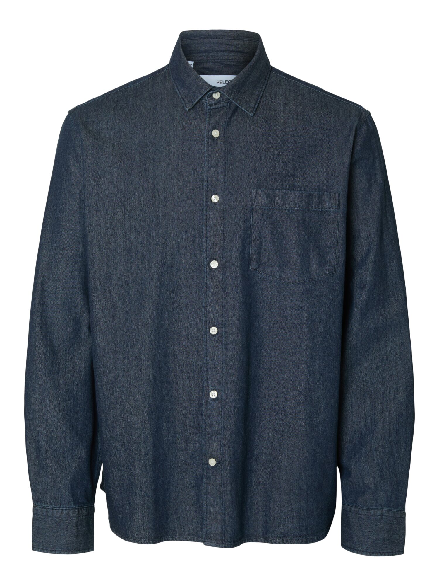 Camicia dark blue denim con tasca sul petto in cotone biologico. Un capo comodo per essere utilizzato sia di giorno che di sera.