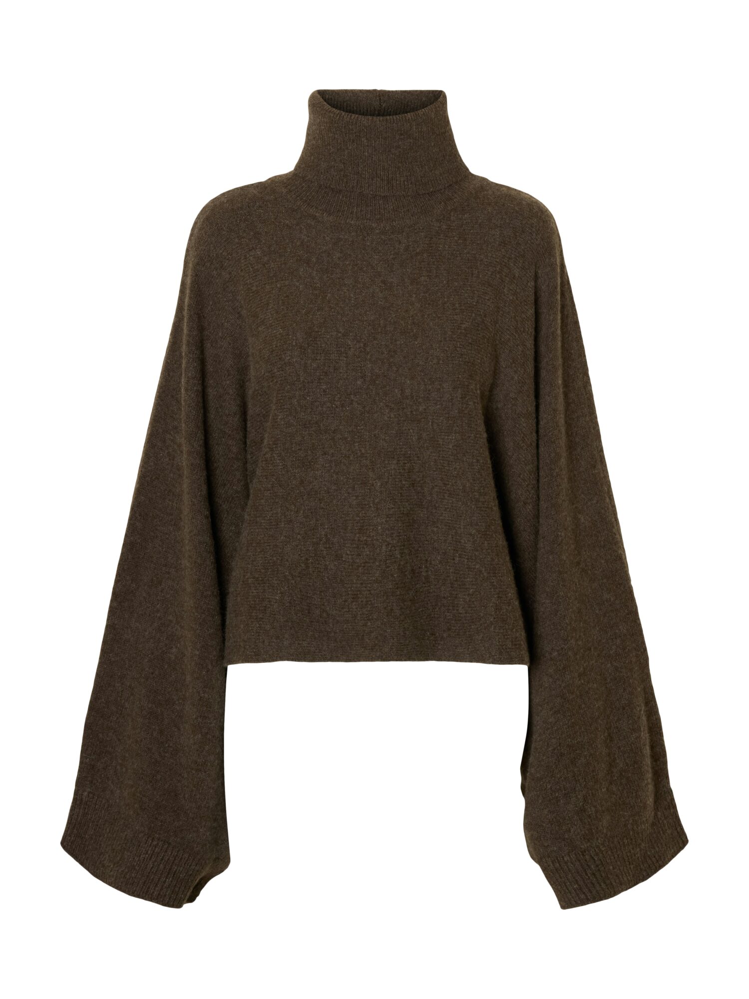 Cappa in maglia a collo alto, realizzata in misto lana color marrone mรฉlange che dona calore e comfort ad un modello contemporaneo femminile e raffinato. La sua vestibilitร  morbida avvolge le spalle con grazia, mentre il taglio leggermente cropped dona proporzioni moderne e sofisticate. La chiusura nascosta con bottoni sulle maniche crea una linea pulita e impeccabile, esaltando la naturale fluiditร  del design. Perfetta da indossare sopra abiti o da abbinare a pantaloni a vita alta, รจ il capo versatile che completa con stile ogni look invernale.
